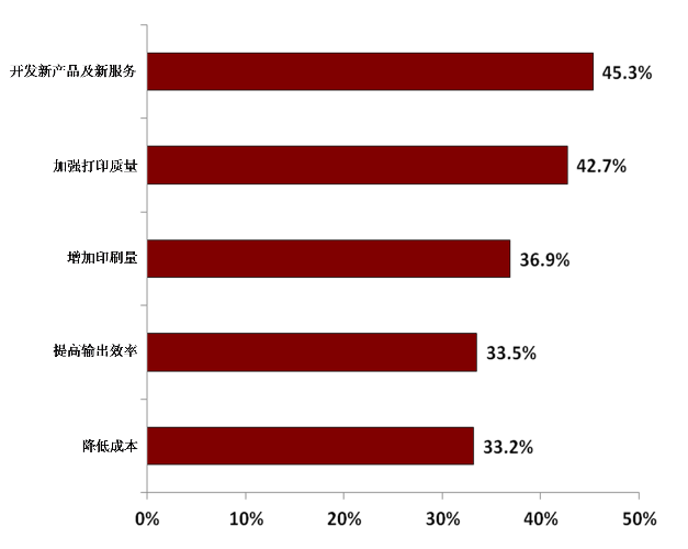 大部分投資是由于新市場對新制品、新服務(wù)的需要促成的(圖10)。打印商家在擬定投資計(jì)劃時(shí)亦越來越注重對戰(zhàn)略的思慮。同期,印刷質(zhì)量的加強(qiáng),印刷量的增多,輸出速度的增多及成本的下降都對投資有所影響。