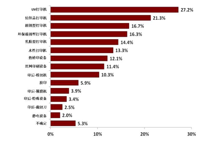 超過一半的受訪者解釋了她們花費(fèi)將近10萬歐元購買大幅面打印設(shè)備的目的。購買名單中有uv打印機(jī)、紡織品打印機(jī)、溶劑型打印機(jī)、弱溶劑型打印機(jī)及乳膠型打印機(jī)。模切機(jī)和覆膜機(jī)是受訪者們列為將要購入的首要設(shè)備(圖8)。