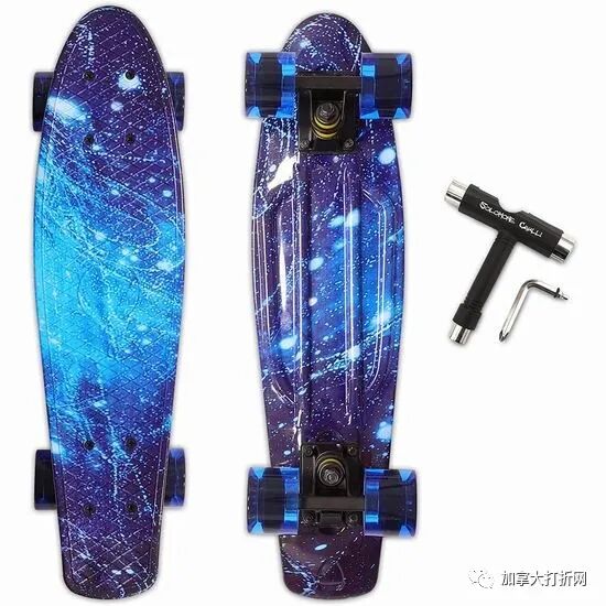 造型緊湊輕巧,由ABS塑料制成,配備精細輕巧的ABEC-7高速軸承,輕巧便攜,配備4個超光滑PU輪子,最大承重220磅,板面尺寸22 英寸 x 6 英寸。