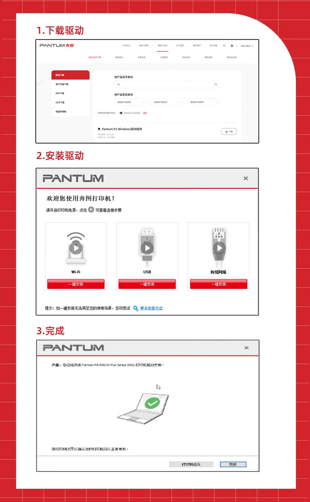 用戶只需打開奔圖官網(wǎng),在“服務與支持”下點擊“驅(qū)動/文件下載”,輸入打印機型號后點擊一鍵安裝,電腦或平板等設(shè)備就會快速搜索打印機連接狀態(tài)和網(wǎng)絡環(huán)境,智能檢測可運用的連接方式。全部過程免去了選安裝目錄、菜單、系統(tǒng)、型號等繁瑣過程,最大程度縮減操作流程,輕容易松搞定驅(qū)動安裝~