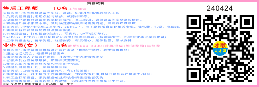 開機工 3名(絲網(wǎng)機 )盤帶女工 3名包吃包住位置:東陽五馬塘昆溪路26號珊瑚里綜合樓另招: